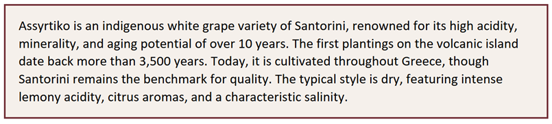 Assyrtiko is Greece’s flagship white grape variety. Its homeland is Santorini, and it is world-renowned for its ability to produce white wines with extraordinary acidity, a signature salty minerality, and a rare aging potential for a white wine produced in such a warm climate.
